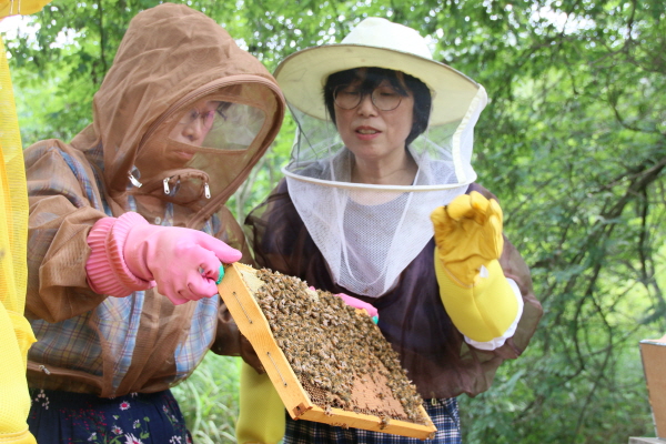 요즘은 대규모 양봉이 아니라 2통에서 10통 정도의 꿀벌을 키우며 친환경 꿀을 수확해 지인들과 나눠먹는 취미 양봉의 인구가 점차 늘고 있다. 이에 신영미 씨는 배지숙 씨와 함께 설탕물 사양과 살충제, 항생제를 과도하게 사용하는 관행적인 사육법에서 벗어나 친환경적으로 꿀벌을 키우는 방법을 공유하기 위해 <365일 꿀벌 기르기> 책을 쓰게 됐다. 벌을 어떻게 키우고, 벌통은 또 어떻게 관리해야 하는지를 알려주는 교육 현장에서 저자 신영미 씨를 만나 이야기를 나누었다.