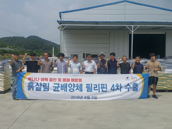 (주)흙살림은 8일 충북 괴산군에 위치한 흙살림 공장에서 필리핀 다바오로 흙살림균배양체 20톤을 컨테이너에 실어 출고했다. 수입업체인 필리핀 로토프레쉬(ROTTO FRESH)사는 2014년부터 바나나 농장 토양 개량 및 파나마병(병원균:Fusarium oxysporum-시들음 유발) 예방을 위해 흙살림과의 공동 시험을 통해 흙살림 균배양체의 효과가 탁월한 것을 확인하고 2016년부터 균배양체를 수입해 지금까지 100톤을 수입해왔다.
